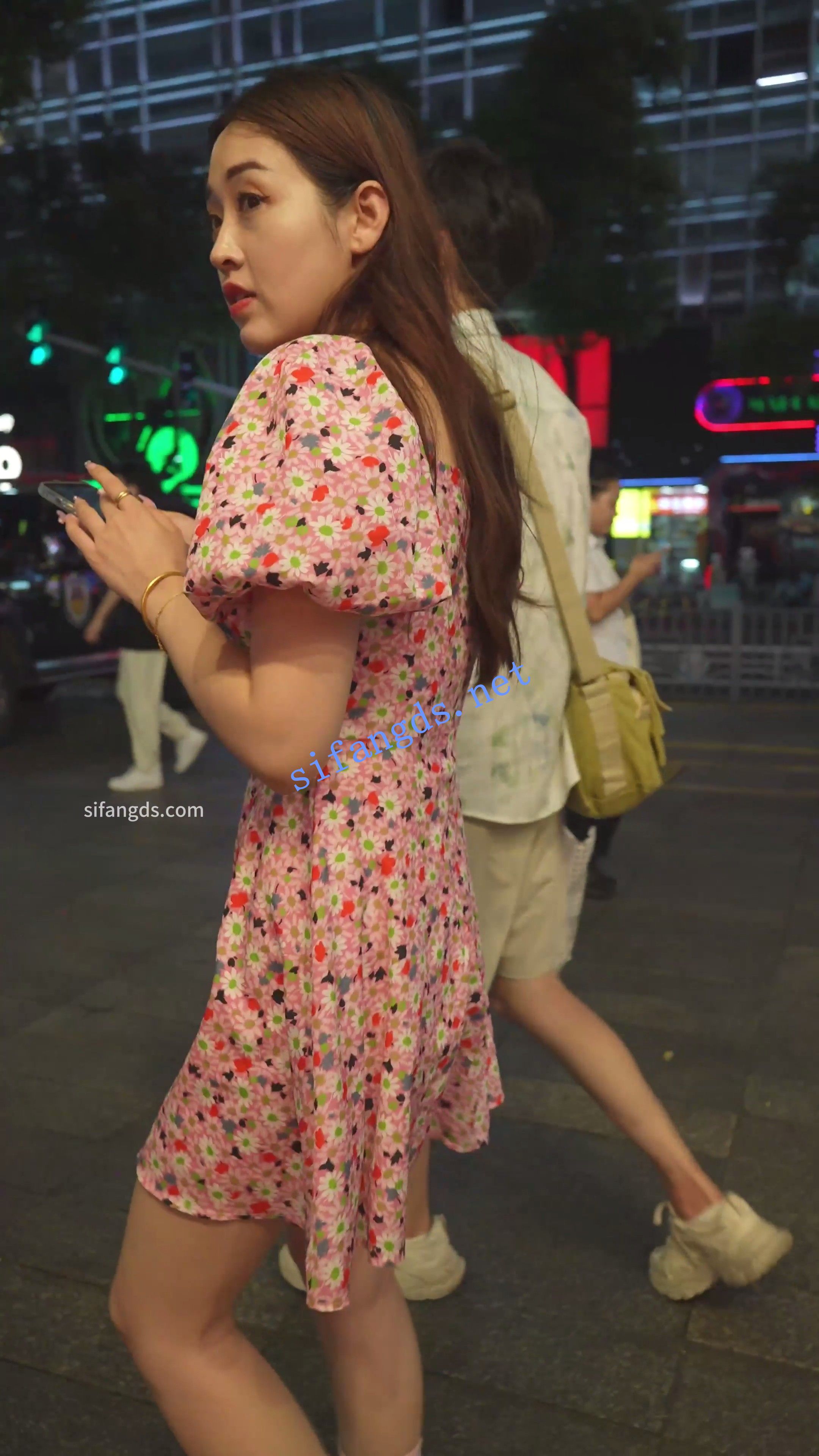 粉色花裙小姐姐逛街,裙子被风吹起,透明爱心内。
