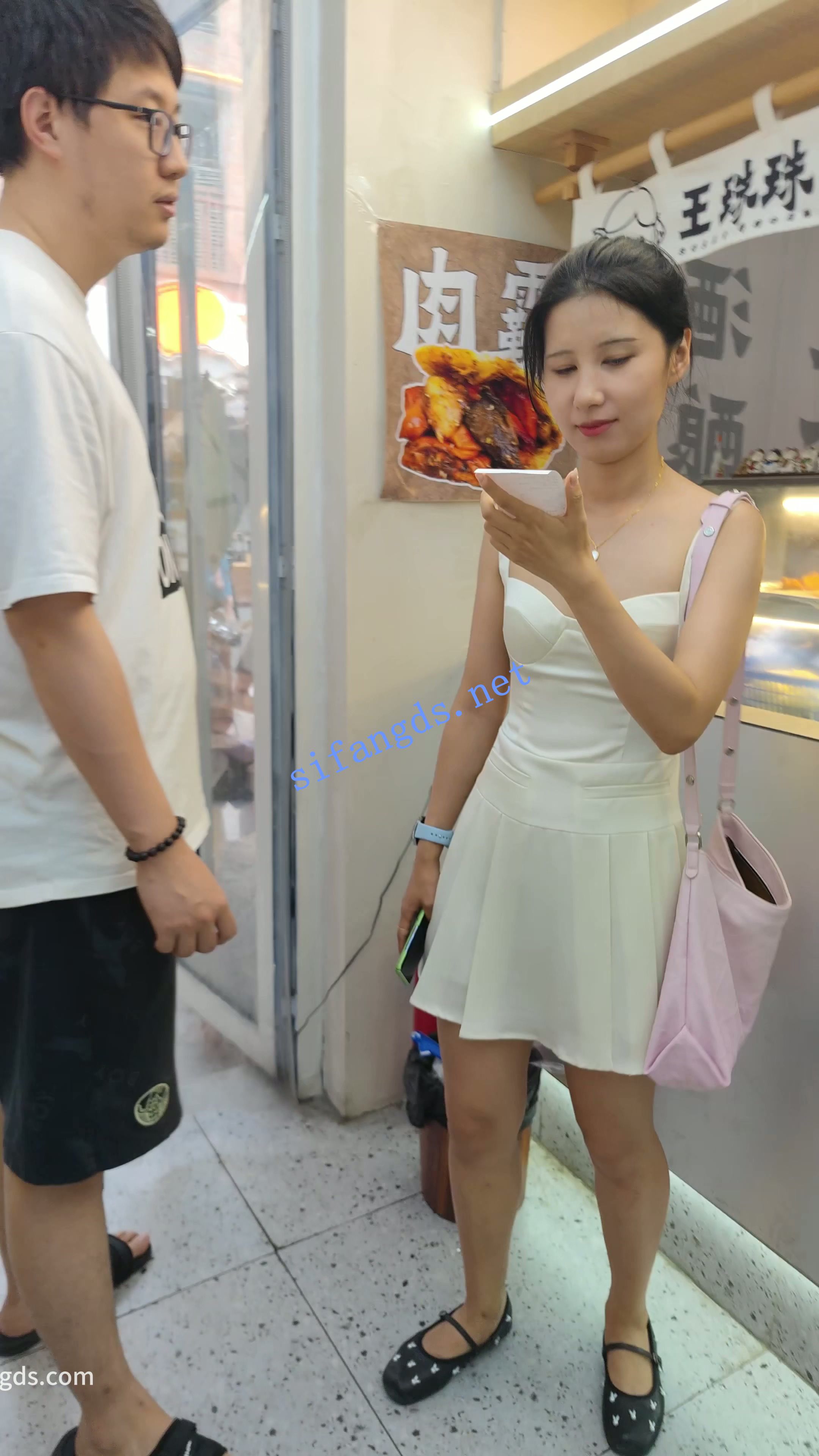 【说明】:白色连衣裙小姐姐和男朋友逛街,白色内内
